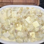 Add sautéed onions on top of sliced potatoes and butter.