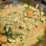 When the veggies are cooked to your liking, add in the whole can of coconut milk, ginger, peanut butter, and red curry paste.
